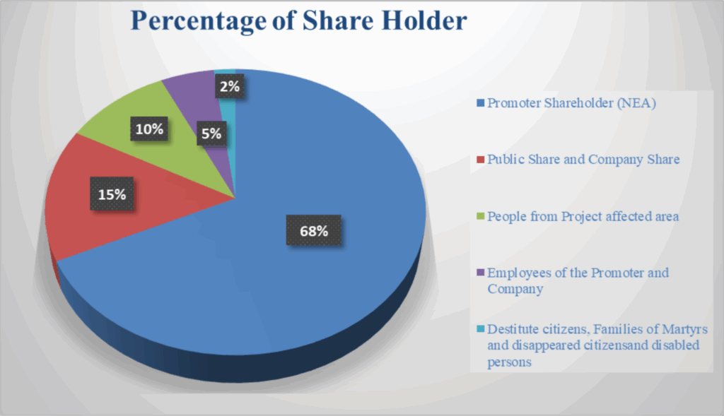 NEA presently has 100% promoter shares. Dudhkoshi Jalvidyut Company Limited proposes to have the following share structure at Initial Public Offer (IPO):